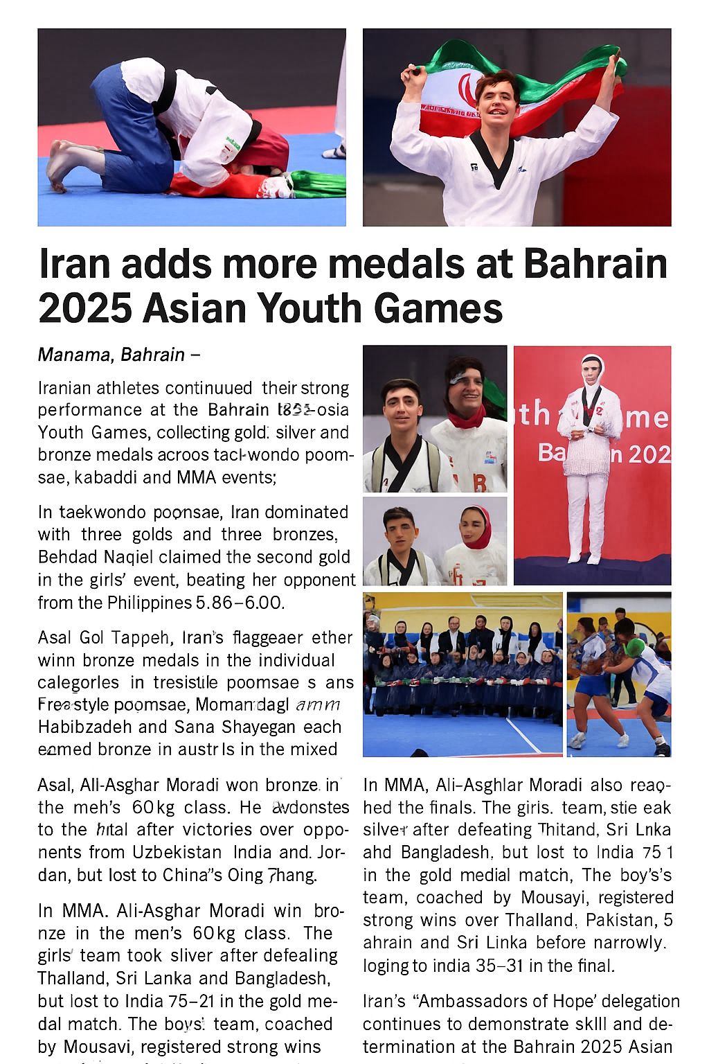 Iranian athletes continued their strong performance at the Bahrain 2025 Asian Youth Games, collecting gold, silver and bronze medals across Taekwondo poomsae, Kabaddi and MMA events.