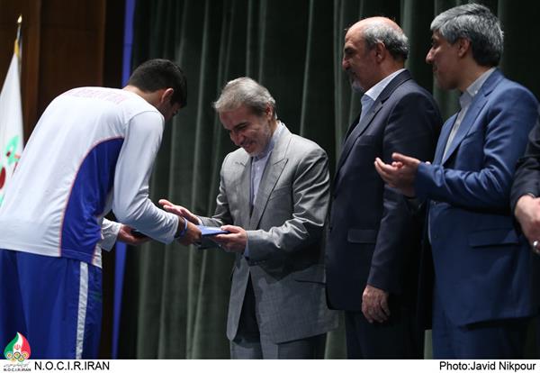 در حاشیه مراسم بدرقه کاروان اعزامی به هفدهمین دوره بازیهای آسیایی اینچئون از مدال آوران ایران در دومین دوره بازیهای المپیک نوجوانان به همراه کادر فنی آنها نیز تجلیل به عمل آمد.