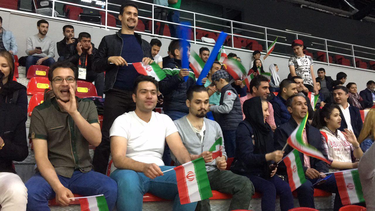 سالن کریستال هال تقریبا خالی از تماشاگر است که چند دانشجوی ایرانی و جمعی از ایرانیان و اهالی سفارت در سالن حضور دارند و تیم ایران را تشویق میکنند و با تشویق های خود جو سالن را کاملا به سود ایران کرده اند.