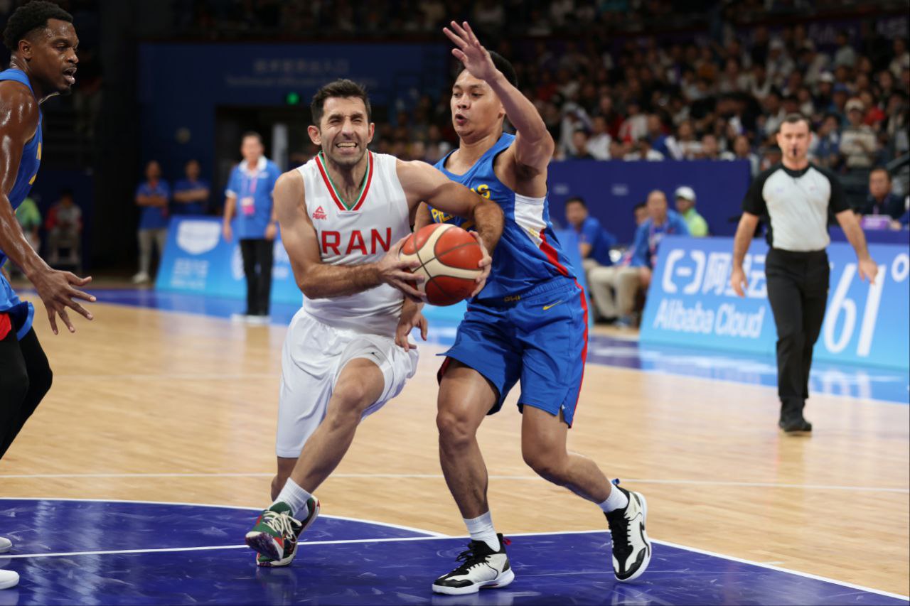 هاکان دمیر شاگردانش را با ترکیب ارسلان کاظمی،میثم میرزایی،نوید رضایی فر،متین آقاجانپور؛سجاد مشایخی سالن ژی جیانگ یونیورسیتی ژیمنازیوم هانگژوبه میدان فرستاد رقابتی که از میان ایران و فیلیپین یک تیم به نیمه نهایی راه پیدا می کرد.هر چند گلزنی نوید رضایی فر بازی را استارت زد ولی جاستین برونلی بازیکن حریف در همان ابتدا سه پرتاب سه امتیازی را روانه حلقه ایران کرد و 11- 8 فیلیپین را پیش انداخت.این بازیکن در کوارتر اول تنها 16 امتیاز اورد و توانست تیمش را در این تایم 28 – 22 پیروز شود.