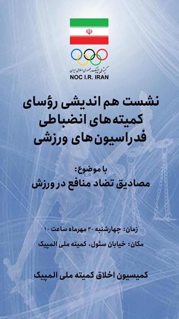 روساء و اعضای کمیته انضباطی فدراسیونهای ورزشی به همت کمیسیون اخلاق کمیته ملی المپیک در نشست ویژه ای چهارشنبه 30 مهرماه در سالن همایش های کمیته ملی پارالمپیک گرد هم می آیند.